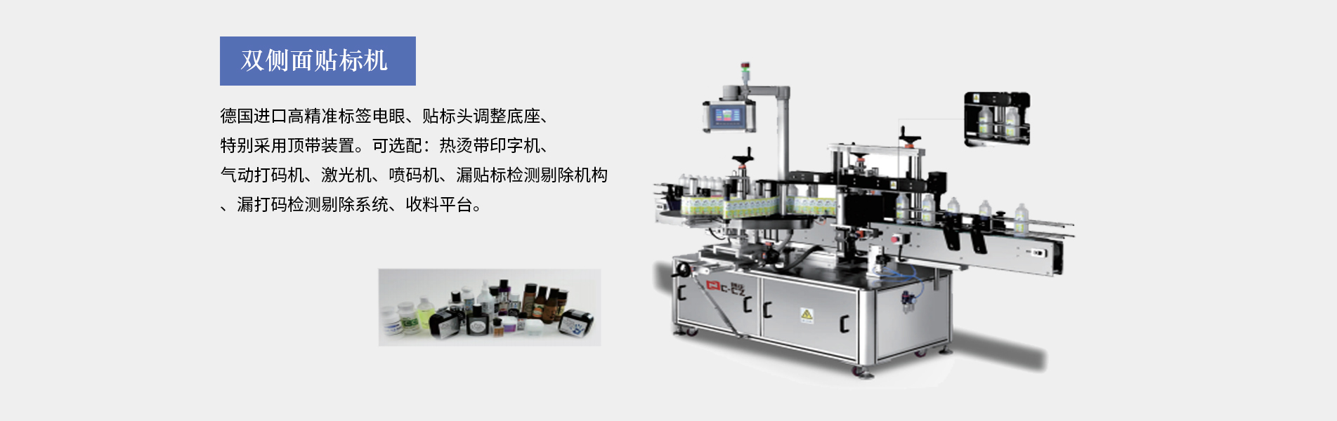本公司生產(chǎn)的口服液貼標(biāo)機(jī)適合細(xì)長形圓柱體瓶圓周表面的不干膠標(biāo)簽自動貼標(biāo),口服液瓶等,采用彩色人機(jī)界面,離合器設(shè)計,使標(biāo)簽張緊力更加穩(wěn)定,便于提高貼標(biāo)精度3、西門子PLC控制,德國、日本光眼,高精度步進(jìn),貼標(biāo)速度可達(dá)30米/分鐘,可加裝色帶打碼機(jī)、或者熱轉(zhuǎn)印機(jī)。口服液貼標(biāo)機(jī)多為圓瓶貼標(biāo)機(jī)適用于瓶身長,直徑的產(chǎn)品(玻璃塑料都可以,材質(zhì)不限),同時可加工粉針劑瓶、采血管、水針劑瓶、眼藥水瓶、圓管等,專門針對...