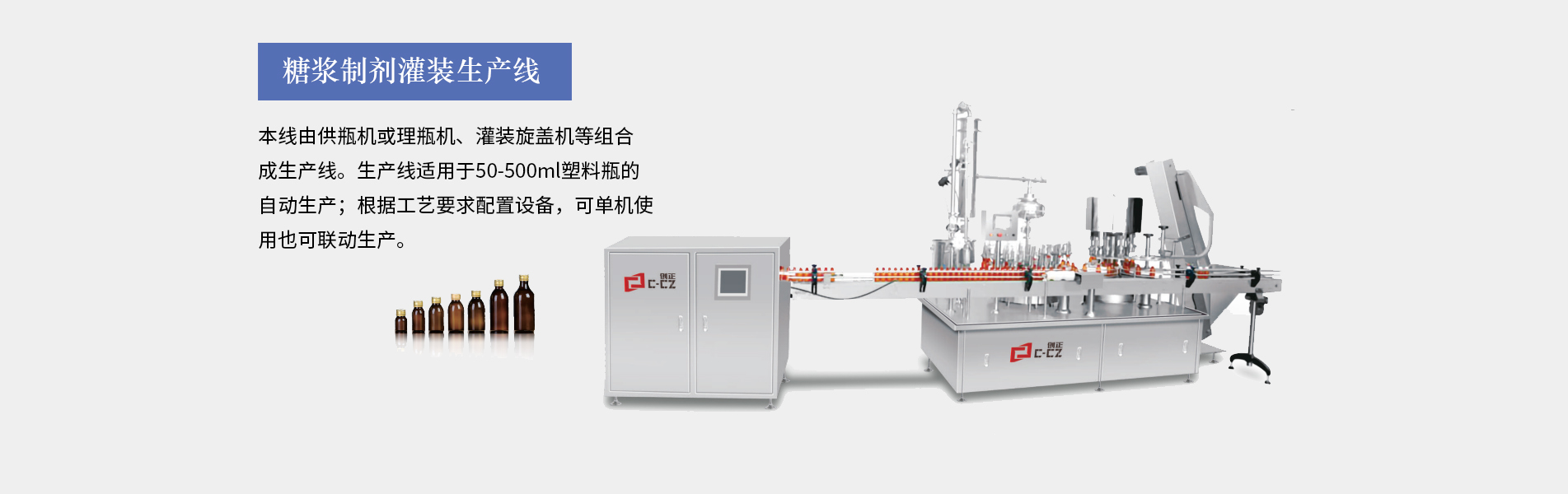 糖漿灌裝生產(chǎn)線適合30ML以上口服液的灌裝生產(chǎn),由供瓶機(jī)、直線式灌裝軋(旋)蓋機(jī)、立式貼標(biāo)機(jī)等設(shè)備組成,可全自動完成灌裝、上蓋、旋(軋)蓋、貼標(biāo)等工序。主要用于制藥、食品、化工的的各種液體物料的灌裝聯(lián)動生產(chǎn)。本生產(chǎn)線完全符合GMP要求。糖漿灌裝生產(chǎn)線特點裝量特征:無滴漏、不起泡、不飛濺。運(yùn)行特征:運(yùn)行穩(wěn)定,噪音小;灌裝精確,能耗少,破瓶率低,成品合格率高性能特征:整條生產(chǎn)線可單機(jī)控制和聯(lián)鎖控制。洗瓶...